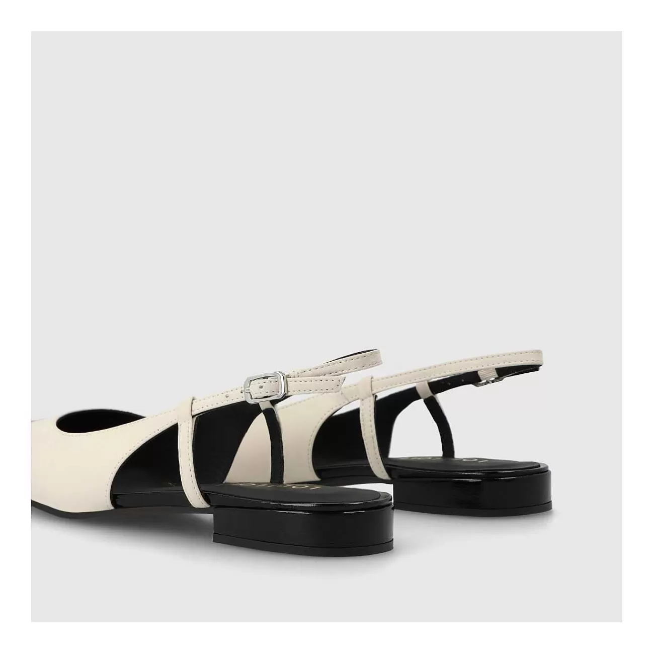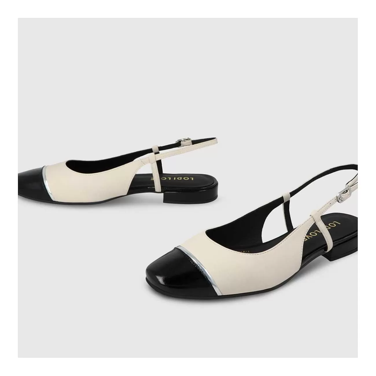 Bailarinas Destalonadas De Mujer Amb4471 De Lodi En Piel Brillante De Color Negro Y Blanco Roto. Detalle De Tira En Punta De Piel Efecto Espejo Al Tono. Ideales Para Tu Día A Día. Un Diseño Confeccionado Con Tacón De 2 Cm De Altura. Cierre En Lateral Mediante Hebilla Metálica. Punta Y Escote Redondo. Interior Forrado En Piel. Incluye Planta New Gel Para Mayor Comodidad En Todas Tus Pisadas. Fabricado En España.