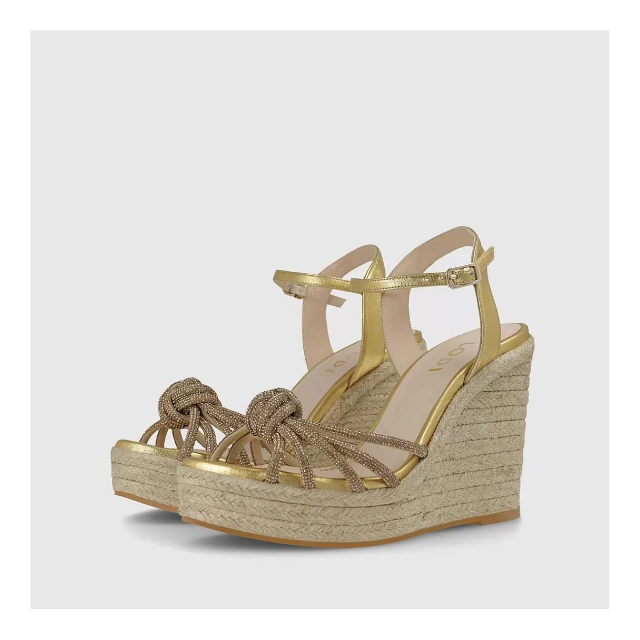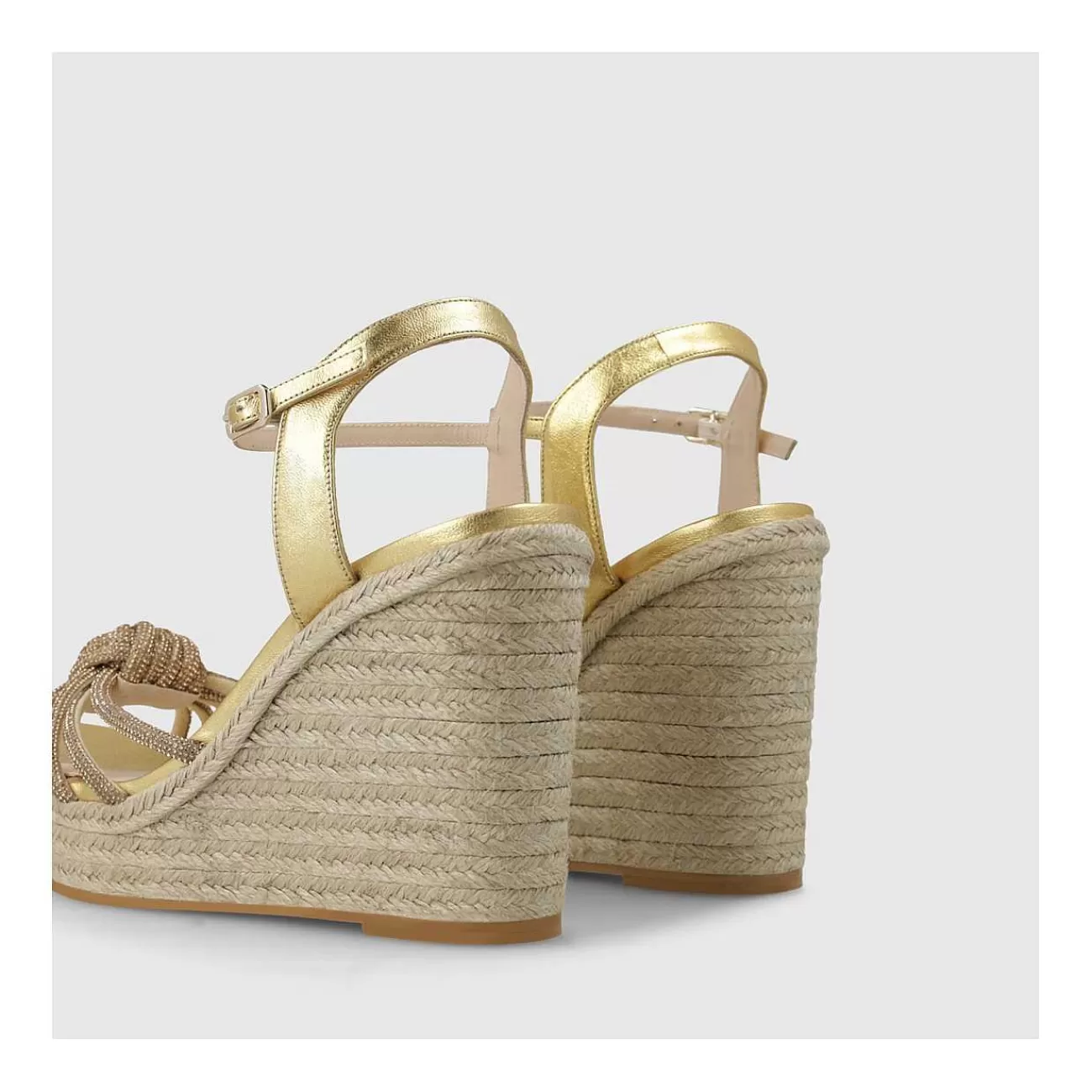 Sandalias De Plataforma De Mujer Yukin De Lodi En Piel Metalizada De Color Oro. Cuñas Combinadas Con Pala En Tiras Y Nudo En Pedrería, Aportando Así Un Toque De Glamour En Tus Eventos Más Especiales. Un Diseño Confeccionado Con Cuña En Yute De 11.5 Cm Y Plataforma De 3.5 Cm De Altura. Cierre Lateral Mediante Hebilla Metálica. Interior Forrado En Piel. Incluye Planta New Gel Para Mayor Comodidad En Todas Tus Pisadas. Fabricado En España
