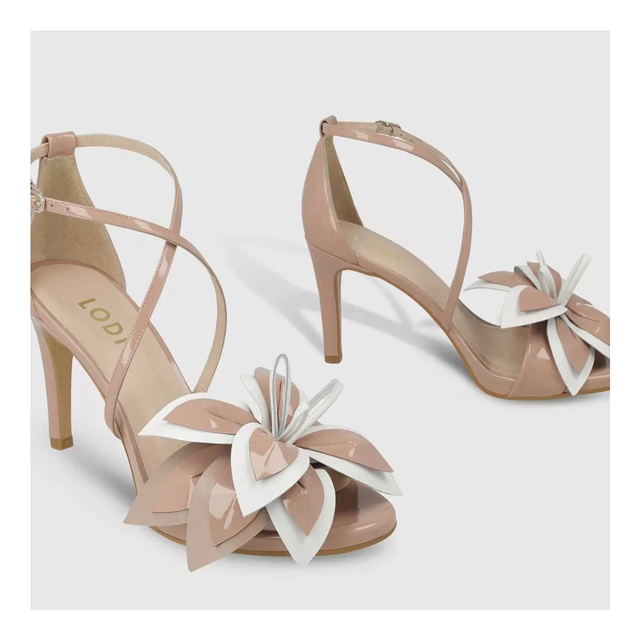 Sandalias De Tacón De Mujer Isorni De Lodi En Charol. Detalle De Flor En Piel Combinada En Tonos Beiges Y Blancos. Un Diseño Confeccionado Con Tacón Fino De 9.5 Cm De Altura. Cierre Lateral En Tira Desde El Empeine Mediante Hebilla Metálica. Punta Redondeada. Interior Forrado En Piel. Incluye Planta New Gel Para Mayor Comodidad En Todas Tus Pisadas. Fabricado En España