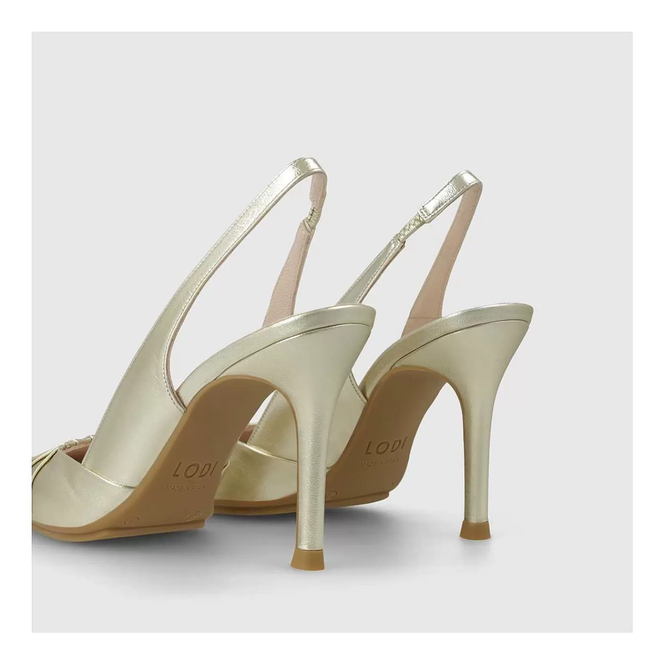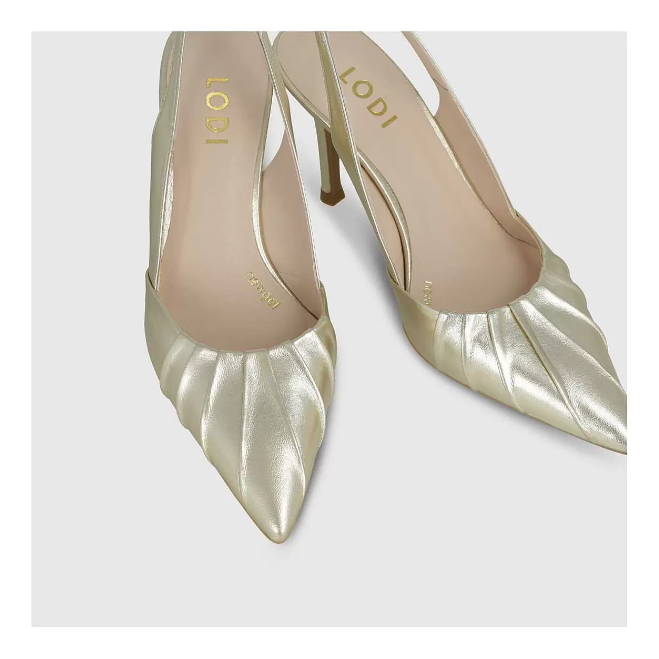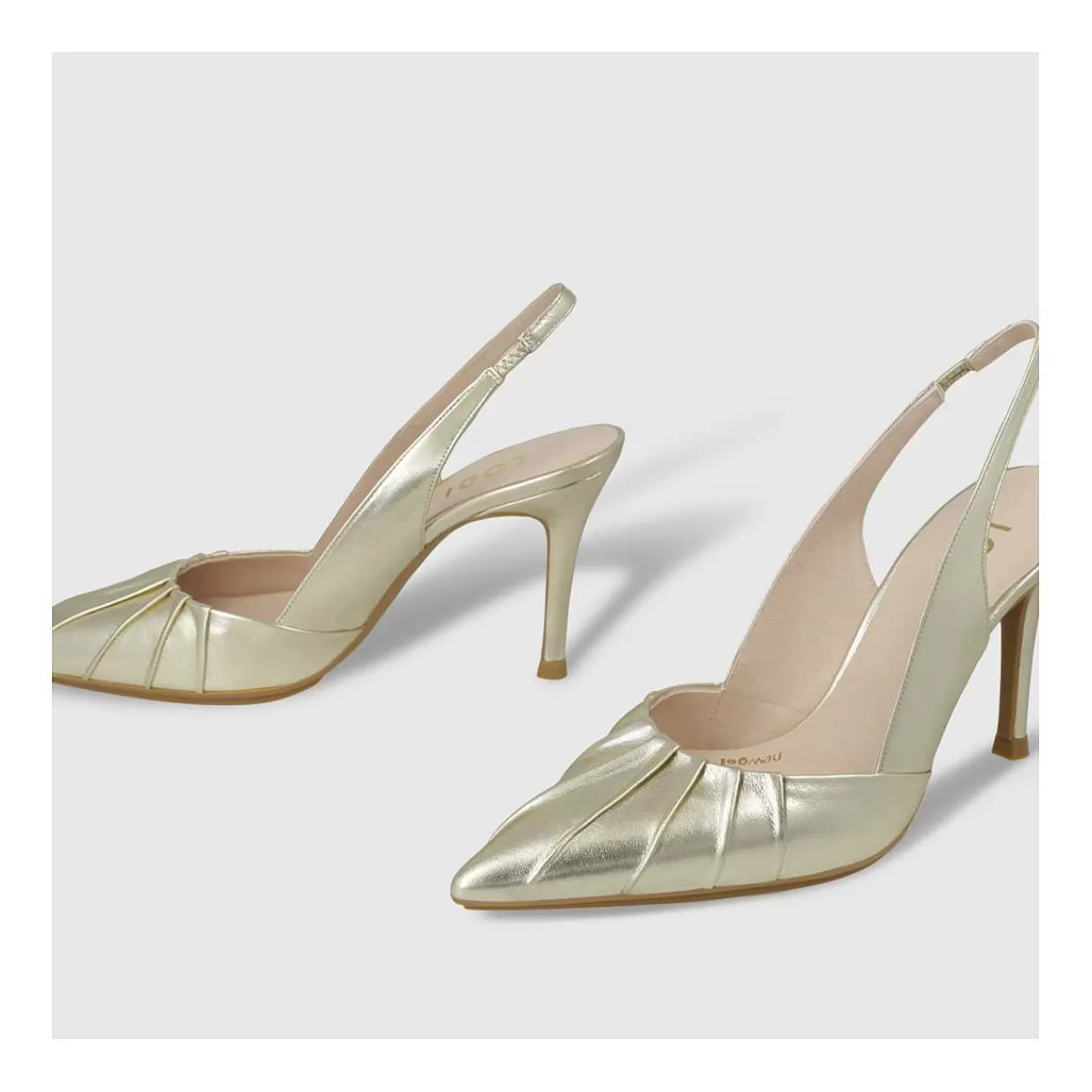 Zapatos De Salón Destalonados De Mujer Safine De Lodi En Piel De Color Oro Claro. Destaca Detalle De Pliegues En La Parte Delantera. Un Diseño Confeccionado Con Tacón Fino De 9.5 Cm De Altura. Punta Fina Y Escote Redondo. Interior Forrado En Piel. Incluye Planta New Gel Para Mayor Comodidad En Tus Pisadas. Fabricado En España.