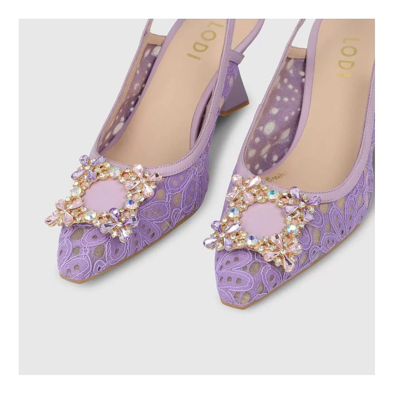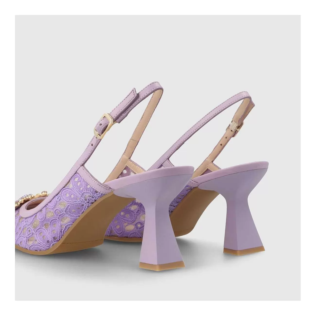 Zapatos De Salón Destalonados De Mujer Asune De Lodi En Tejido Tipo Encaje Floral De Color Lila.Combinado Con Adorno En Pedrería, Aportando Luz Y Sofisticación En Tus Eventos Más Especiales. Confeccionado Con Un Tacón Geométrico Pintado De 8 Cm De Altura. Cierre Mediante Hebilla. Incluye Planta New Gel Para Mayor Comodidad En Todas Tus Pisadas. Fabricado En España.