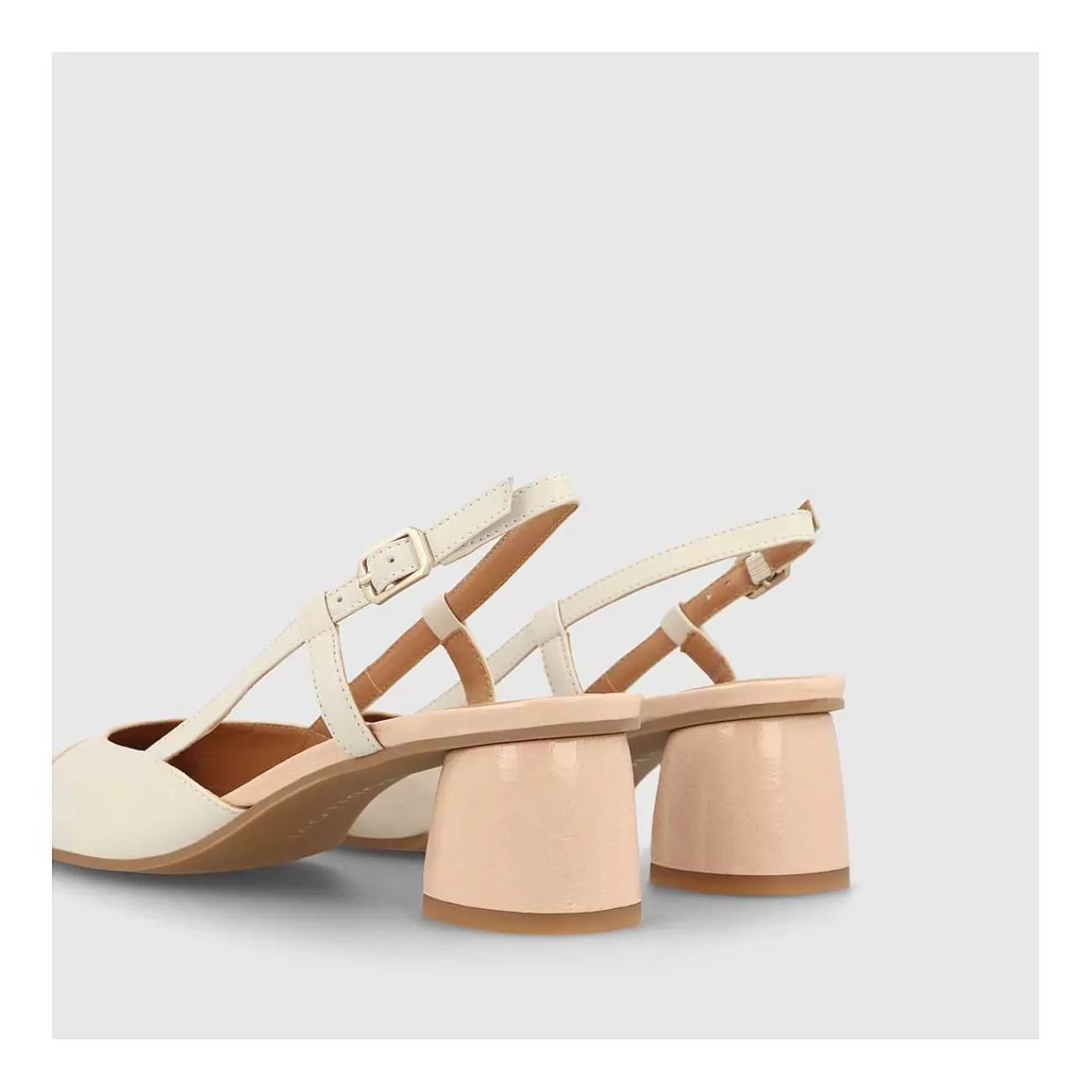 Zapatos De Salón Destalonados De Mujer Rol4343 En Piel Brillo Combinada De Color Nude Y Blanco Roto. Destaca Detalle De Tiras Y Oberturas En Laterales. Un Diseño Confeccionado Con Tacón De 5 Cm De Altura. Cierre Lateral Mediante Hebilla Metálica. Punta Redonda. Interior Forrado En Piel. Incluye Planta New Gel Para Mayor Comodidad En Todas Tus Pisadas. Fabricado En España.