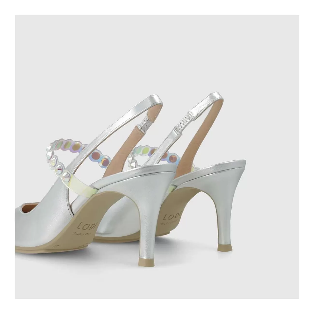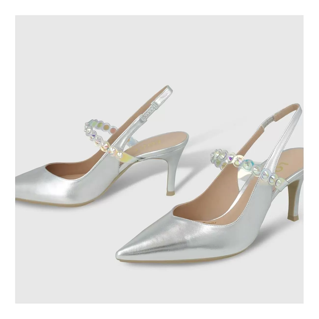 Zapatos De Salón Destalonado De Mujer Elux De Lodi En Piel Metalizada De Color Plata. Combinación De Tira Vinilo Con Pedrería Al Tono En Empeine. Punta De Pico Y Escote Redondeado. Confeccionado Con Tacón De 7.5 Cm, Altura Ideal Para Eventos Prolongados Donde Lucir Con Estlio Sin Sacrificar El Confort. Incluye Planta New Gel Para Mayor Comodidad En Todas Tus Pisadas. Fabricado En España.